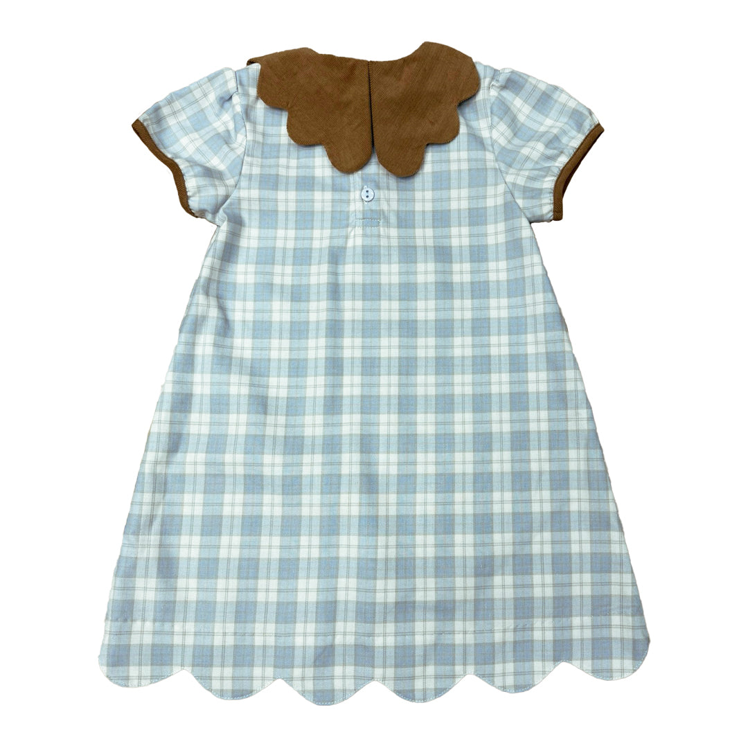 A timeless heirloom piece with a touch of modern charm, this blue plaid dress features a beautifully detailed brown scalloped collar and matching sleeve trim. The soft A-line silhouette is finished with a scalloped hem for an extra-sweet boutique look. Crafted from breathable cotton, this dress combines traditional Southern style with everyday comfort—perfect for portraits, holidays, or special outings.