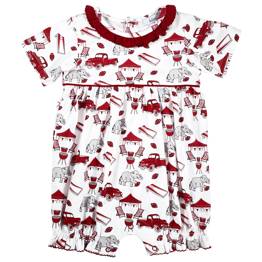 Celebrate game day in style with the Elephant Girl’s Bubble from Ishtex Textile Products' Fall 2025 collection! This adorable baby girl romper features a playful crimson and white tailgate-themed print with elephants, trucks, tents, and footballs—perfect for showing school spirit on Saturdays. Designed with short sleeves and charming crimson ruffle accents, this boutique-style bubble offers both comfort and cuteness. Ideal for cheering on your favorite team or tailgating with family, this romper makes a great baby girl outfit for football season. Available in sizes 3M to 24M.