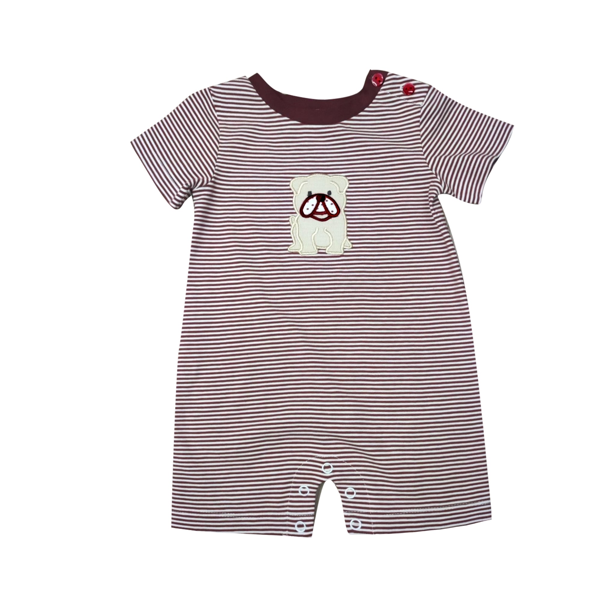 Get your little one game day ready with the Maroon Bulldog Boy’s Romper from Ishtex Textile Products’ Fall 2025 collection. This adorable maroon and white striped romper features short sleeves and a bold bulldog appliqué front and center—perfect for showing team spirit from the crib to the tailgate.