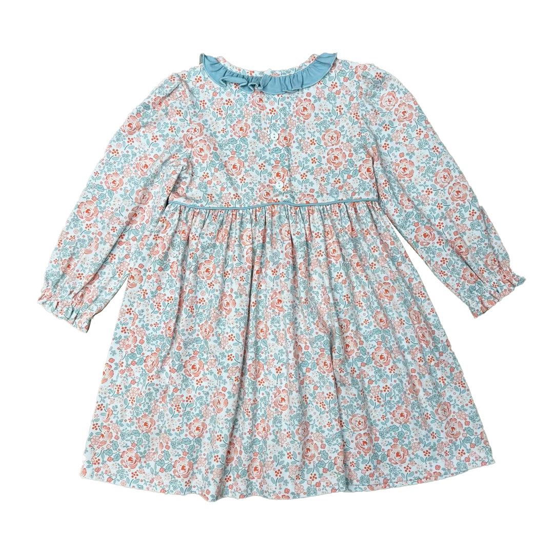 This sweet long-sleeve dress from the Shallot Rose collection is made from a soft cotton blend adorned with a delicate floral print in shades of blush pink and dusty blue. The design features a gathered empire waist with gentle piping for shape and a charming ruffled collar in coordinating blue that adds a classic, vintage-inspired touch. The sleeves are finished with elasticized cuffs for comfort and a hint of fullness. Perfect for special outings or everyday wear, this timeless dress combines elegance and playfulness in a beautiful floral palette that feels both fresh and nostalgic.