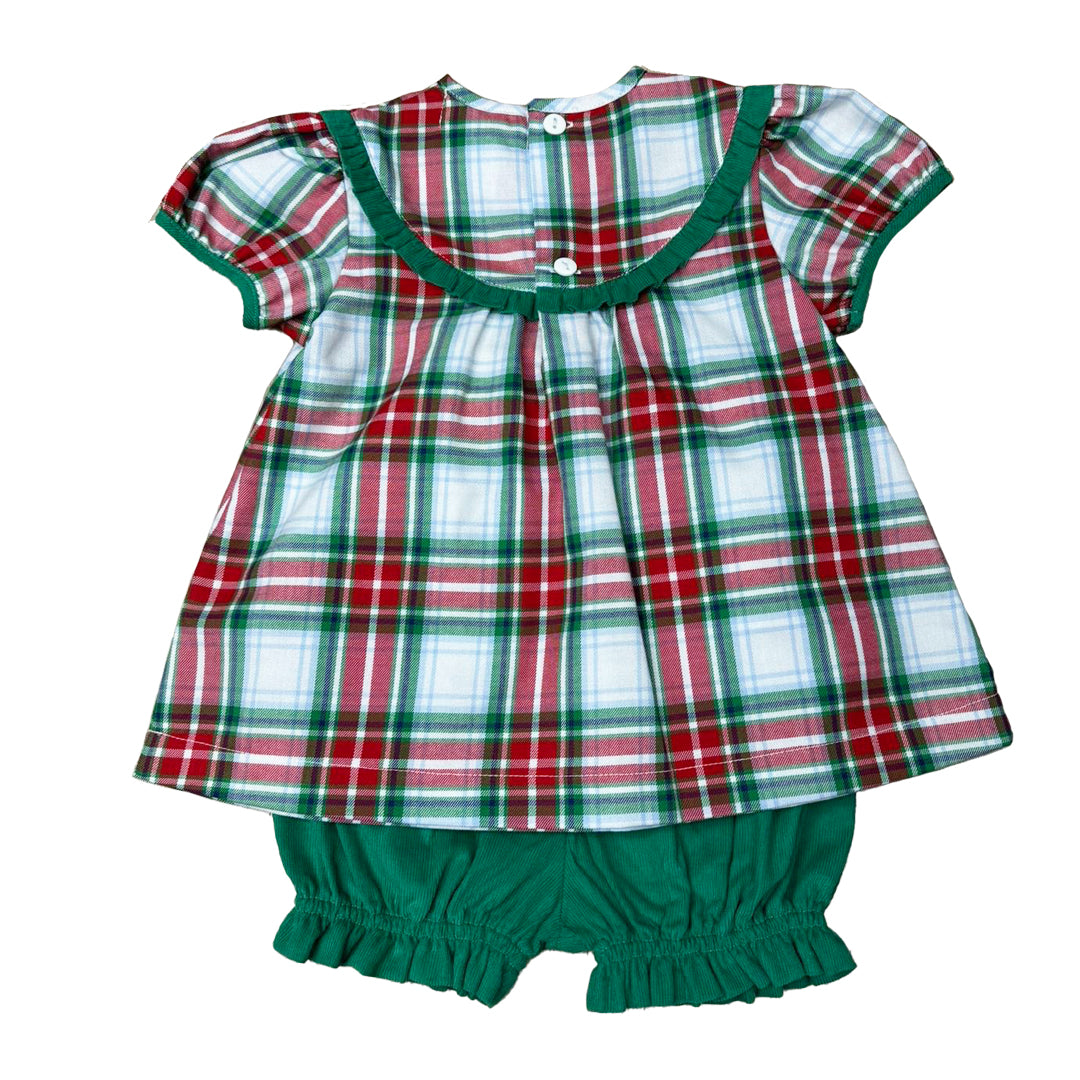 This sweet bloomer set captures the heart of Christmas tradition with its festive red, green, and white woven plaid. The classic A-line top features a gently gathered yoke trimmed in rich green corduroy for a touch of texture and timeless charm. Matching corduroy bloomers complete the look with ruffled leg openings that add just the right hint of playfulness.