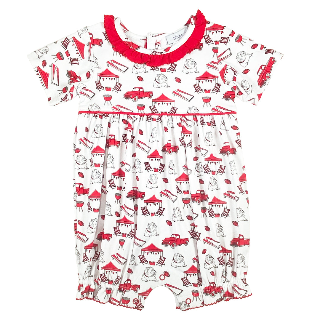 Get your little fan ready to cheer in style with our Bulldog Girl's Bubble! This adorable romper features a playful tailgate-themed print filled with charming bulldogs, vintage trucks, cornhole boards, and cozy tents — all in spirited red and white. Perfect for fall Saturdays and football season, this bubble is a touchdown in comfort and cuteness.